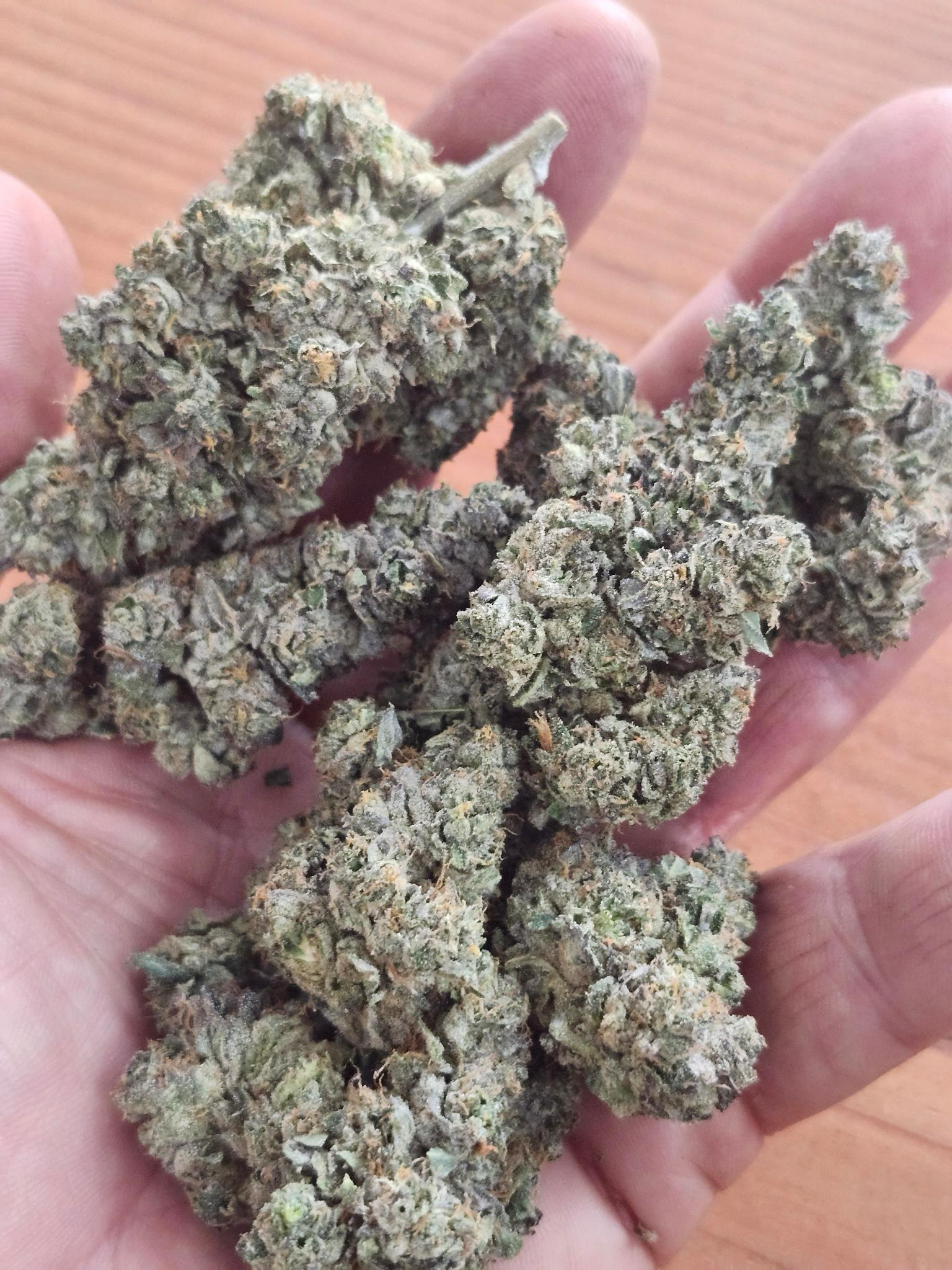 - Appearance: The buds are dark green with purple hues, heavily coated in trichomes, giving them a sparkling, frosty appearance.